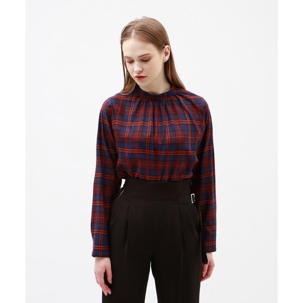 ギャザーネック チェック ブラウス