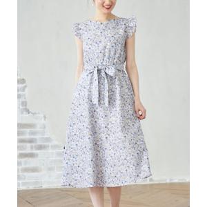ワンピース ウエストりぼん付きハートネック肩フリルフラワープリントワンピース