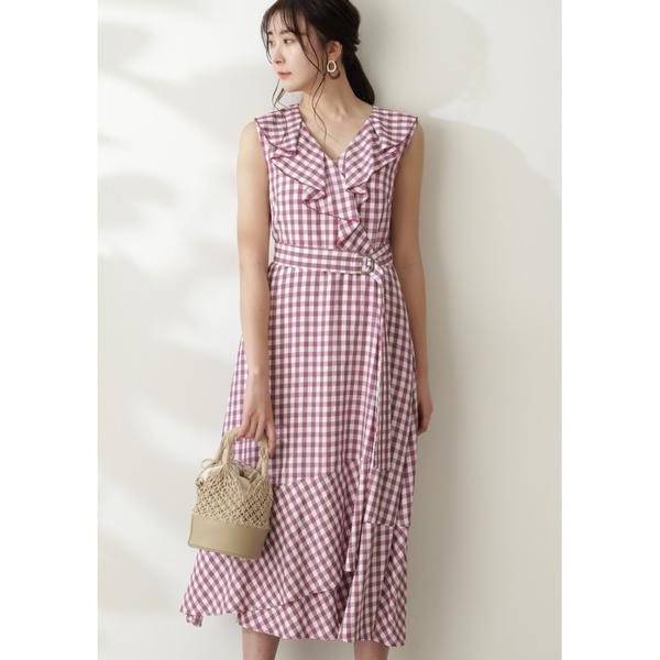 チェックワンピース 大きなラッフル襟 共布のサッシュベルト 後ろファスナー付き 裏地付き