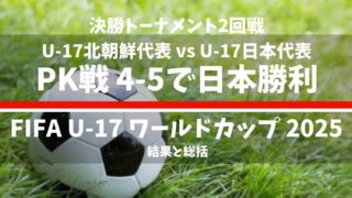 FIFAU-17ワールドカップカタール2025の決勝トーナメント(ノックアウトラウンド)決勝トーナメント2回戦(ラウンド・オブ・16) U-17北朝鮮代表 vs U-17日本代表の試合が終わりましたので結果と総括です。PK戦の末、日本が勝利しました。